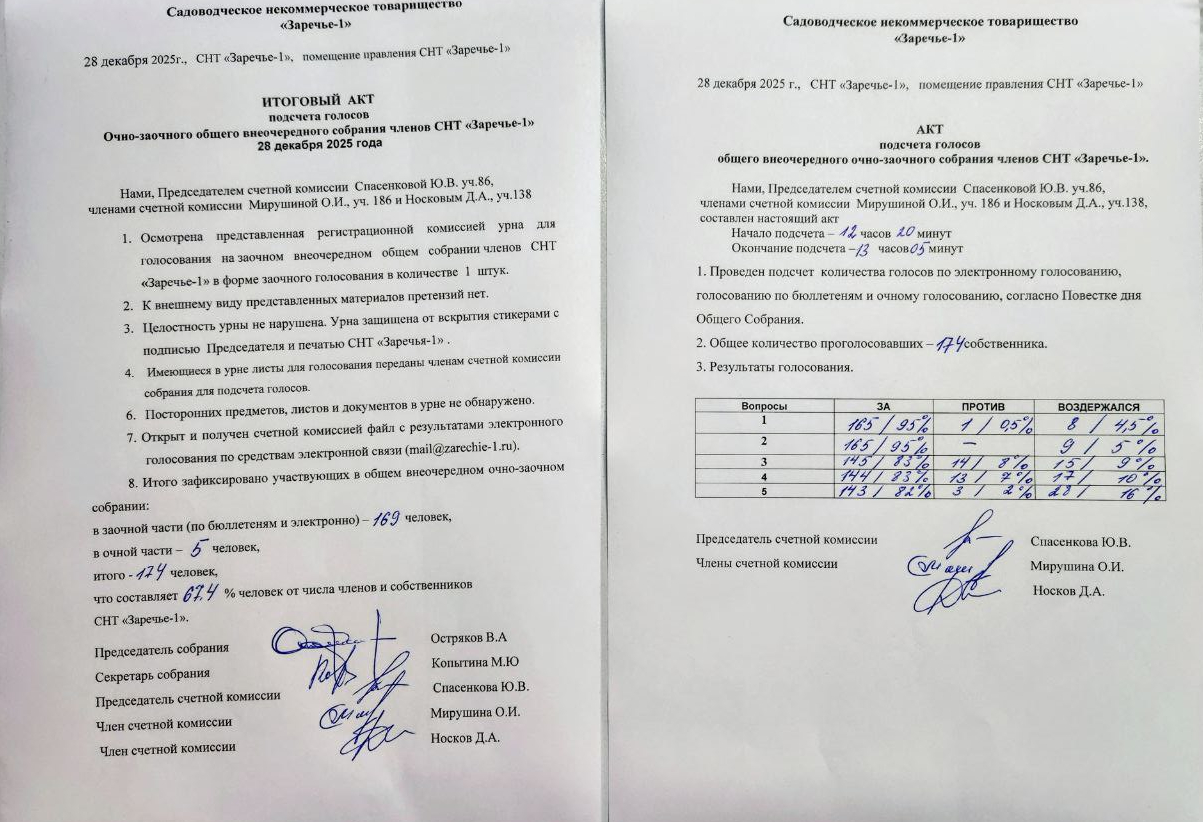 Общее ежегодное собрание членов и собственников СНТ «ЗАРЕЧЬЕ-1» будет проводиться в очно-заочной форме с применением технических средств с 14 по 28 декабря 2025 года. Бюллетени можно будет получить в дни голосования в помещении Правления СНТ по адресу: МО, Пушкинский го, с. Братовщина, СНТ "Заречье-1", ул. Центральная по графику: 14.12 – с 11:00-13:00 часов; 18.12 - с 18:00-20:00 часов; 20.12 - с 11:00- 13:00 часов и с 17:00- 19:00 часов; 21.12 – с 11:00-13:00 часов; 25.12 - с 18:00-20:00 часов; 27.12 - с 11.00-13.00 и с 17.00-19.00 часов; 28.12 – с 11:00 до 12:00 часов Проголосовать вы так же можете непосредственно на сайте СНТ по ссылке, или направив запрос на бюллетень на электронную почту СНТ - mail@zarechie-1.ru или по ссылке Бюллетень для голосования Окончание голосования бюллетенями 02 ноября 2025 г. в 11:00 Повестка дня ежегодного Общего собрания СНТ "Заречье-1" 1. Выборы Председателя и секретаря общего собрания. С Приходно-расходной сметой и финансовым обоснованием на 2026 год вы можете ознакомиться на сайте